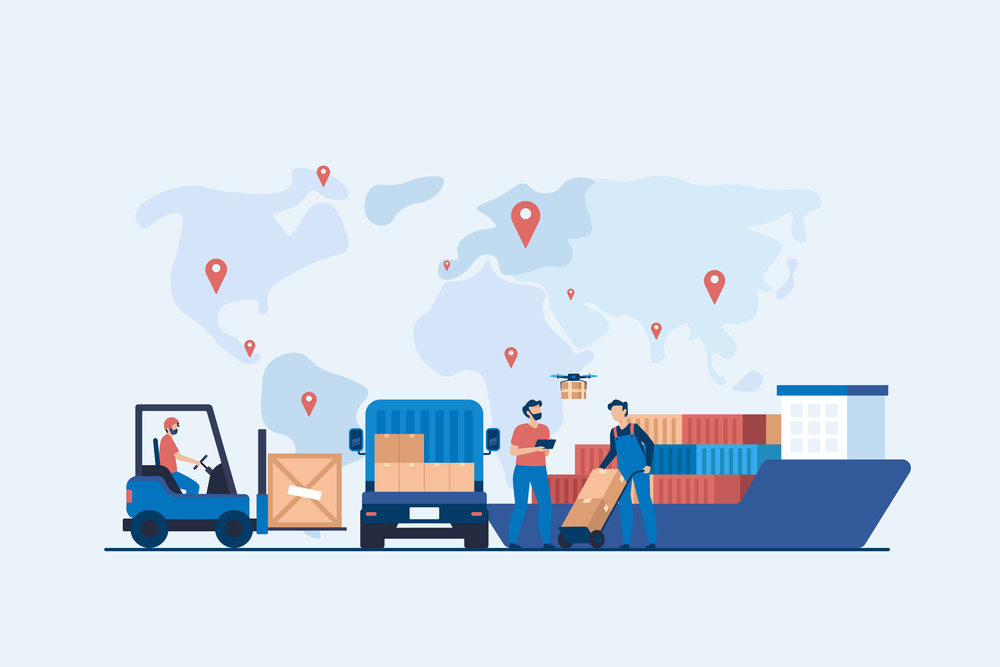airplane, a globe with boxes on the continents, boxes surrounding the globe, with trucks and vans by a cargo ship.Uncategorized